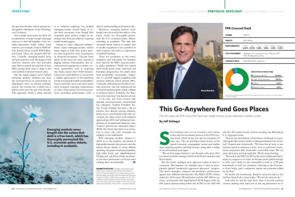 STEVE ROMICK LIKES TO USE COLORFUL METAPHORS to describe his investment process at the FPA Crescent Fund , which he has run since its inception 30 years ago . This go-anywhere fund invests across capital structures , geographies , sectors and market caps , targeting equities and fixed income , along with a dollop of unconventional asset types .