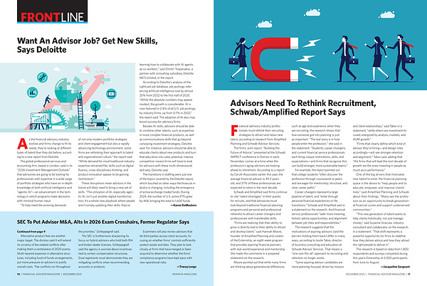 These disruptions mean advisors in the future will likely need to bring a new set of skills.“ The utilization of AI, especially agentic AI, isn’ t just another digital transformation; it’ s a whole new playbook where people aren’ t simply updating their skills, they’ re learning how to collaborate with AI agents as co-workers,” said Dimitri Tsopanakos, a partner with consulting subsidiary Deloitte MCS Limited, in the report.