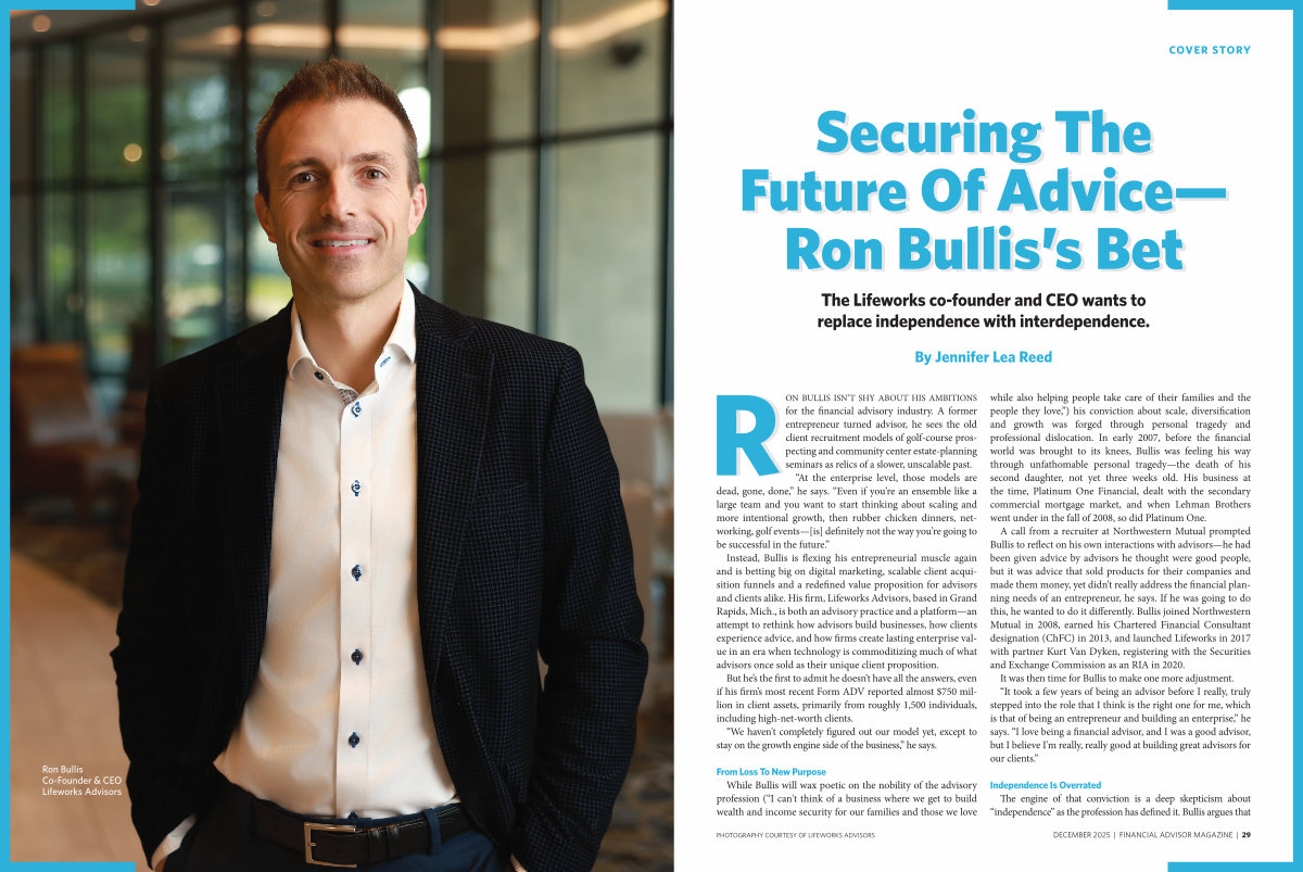 Instead, Bullis is flexing his entrepreneurial muscle again and is betting big on digital marketing, scalable client acquisition funnels and a redefined value proposition for advisors and clients alike. His firm, Lifeworks Advisors, based in Grand Rapids, Mich., is both an advisory practice and a platform— an attempt to rethink how advisors build businesses, how clients experience advice, and how firms create lasting enterprise value in an era when technology is commoditizing much of what advisors once sold as their unique client proposition.