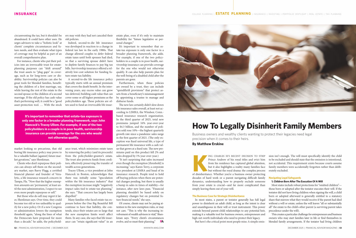 Many families who faced estate-tax exposure before the One Big Beautiful Bill continue to have that liability, she contends, since their estates are so large that the new exemption limits won’ t affect them. In any case, she says that life insurance can“ retain significant value” in an estate plan, even if it’ s only to maintain flexibility for“ future legislative or personal changes.”
