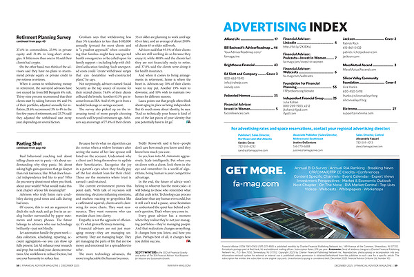 Financial Advisor( ISSN 1545-0163, USPS 021-488) is published monthly by Charter Financial Publishing Network Inc., 149 Avenue at the Common, Shrewsbury, NJ 07702. Periodicals postage paid at Red Bank, NJ and additional mailing offices. Subscription Rates: $ 79 per year. Postmaster: Send all address changes to Charter Financial Publishing Network Inc., P. O. Box 7550, Shrewsbury, NJ 07702. Copyright 2025 by Charter Financial Publishing Network Inc. Reproduction, photocopying or incorporation into any information-retrieval system for external or internal use is prohibited unless permission is obtained beforehand from the publisher in each case for a specific article. The subscription fee entitles the subscriber to one original copy only. Unauthorized copying is considered theft. December 2025 Financial Advisor( Volume 26, Number 10)