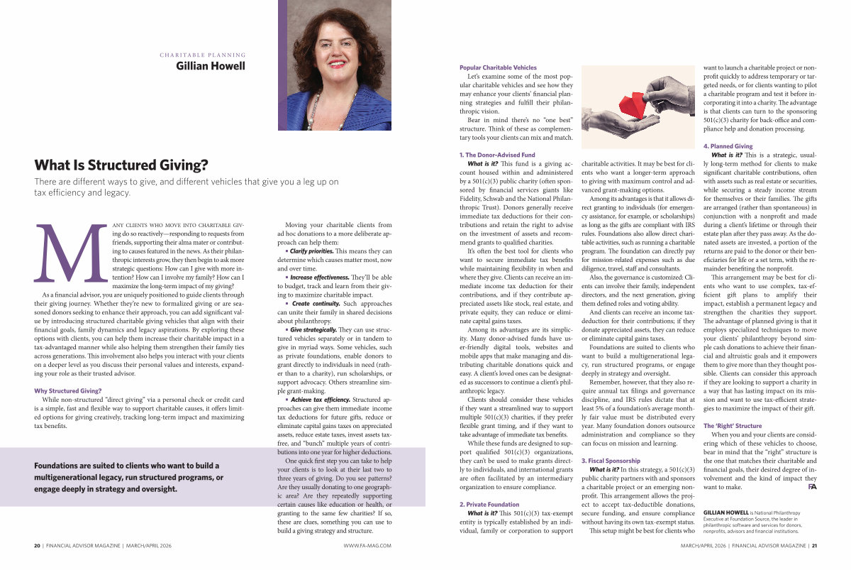 As a financial advisor, you are uniquely positioned to guide clients through their giving journey. Whether they’ re new to formalized giving or are seasoned donors seeking to enhance their approach, you can add significant value by introducing structured charitable giving vehicles that align with their financial goals, family dynamics and legacy aspirations. By exploring these options with clients, you can help them increase their charitable impact in a tax-advantaged manner while also helping them strengthen their family ties across generations. This involvement also helps you interact with your clients on a deeper level as you discuss their personal values and interests, expanding your role as their trusted advisor.