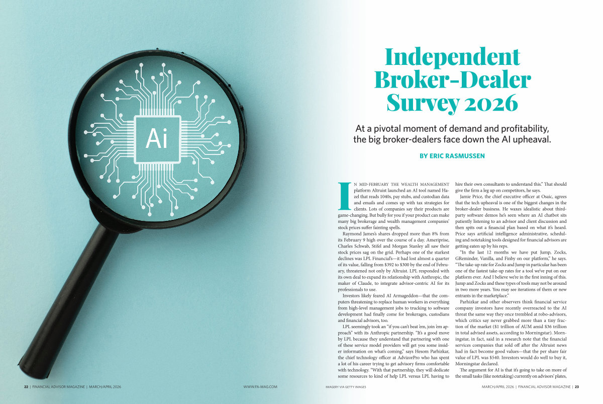 Raymond James’ s shares dropped more than 8 % from its February 9 high over the course of a day. Ameriprise, Charles Schwab, Stifel and Morgan Stanley all saw their stock prices sag on the grid. Perhaps one of the starkest declines was LPL Financial’ s— it had lost almost a quarter of its value, falling from $ 392 to $ 300 by the end of February, threatened not only by Altruist. LPL responded with its own deal to expand its relationship with Anthropic, the maker of Claude, to integrate advisor-centric AI for its professionals to use.