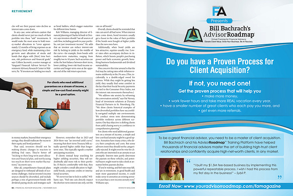 “ We address rate anxiety by reframing the conversation entirely,” says Pat Nerney, head of investment solutions at Dynasty Financial Partners in St. Petersburg, Fla.“ We show clients historical examples of how diversified portfolios have successfully navigated multiple rate environments. We conduct stress tests demonstrating portfolio resilience across different scenarios. Our key objective is shifting clients from yield-chasing worry to confidence in comprehensive planning.”