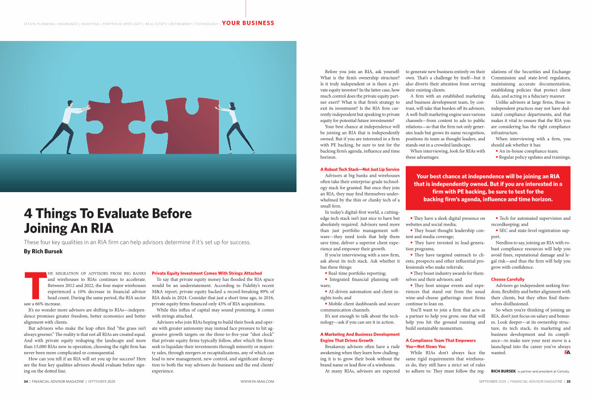 So when you’ re thinking of joining an RIA, don’ t just focus on salary and bonuses. Look deeper— at its ownership structure, its tech stack, its marketing and business development and its compliance— to make sure your next move is a launchpad into the career you’ ve always wanted.