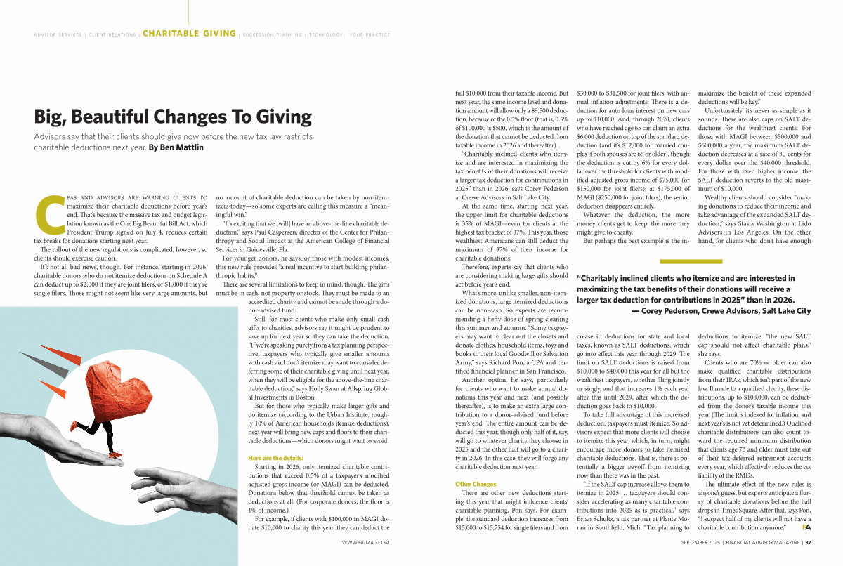 “ Charitably inclined clients who itemize and are interested in maximizing the tax benefits of their donations will receive a larger tax deduction for contributions in 2025” than in 2026.