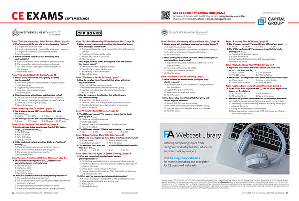 Financial Advisor( ISSN 1545-0163, USPS 021-488) is published monthly by Charter Financial Publishing Network Inc., 149 Avenue at the Common, Shrewsbury, NJ 07702. Periodicals postage paid at Red Bank, NJ and additional mailing offices. Subscription Rates: $ 79 per year. Postmaster: Send all address changes to Charter Financial Publishing Network Inc., P. O. Box 7550, Shrewsbury, NJ 07702. Copyright 2025 by Charter Financial Publishing Network Inc. Reproduction, photocopying or incorporation into any information-retrieval system for external or internal use is prohibited unless permission is obtained beforehand from the publisher in each case for a specific article. The subscription fee entitles the subscriber to one original copy only. Unauthorized copying is considered theft. September 2025 Financial Advisor( Volume 26, Number 7)